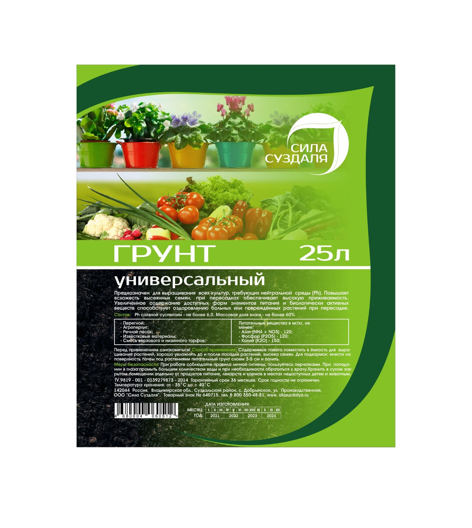 Универсальный грунт для растений - уникальный грунт, сочетающий в себе все необходимые полезные свойства. Так же может быть использован вместе с какими-либо удобрениями или добавками. Грунт в меру увлажненный, представлен в разных объёмах. Предназначен для выращивания всех культур, требующий нейтральной среды (Ph). Повышает всхожесть высеянных семян, при пересадках обеспечивает высокую приживаемость. Увеличенное содержание доступных форм элементов питания и биологически активных веществ способствует оздоровлению больных или поврежденных растений при пересадке. После пересадки следует полить растение и убедиться, что процесс пересадки прошел правильно. Может использоваться как для комнатных растений, так и для тепличных. Обеспечивает обильное цветение и плодоношение.