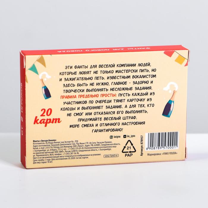 Купить игра для компании "фанты звезда бокала" 20 карт от 120 руб. с доставкой до пункта выдачи в Котельниках. Интернет магазин ДекаМаркет. Оплата при получении.